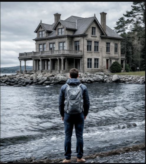 Quando l’asfalto finì, davanti a lui si aprì il lago: scuro, immobile, liscio come vetro. Al centro, emergendo dall’acqua, una grande casa dal profilo scuro, quasi fosse cresciuta direttamente dal fondo del lago.