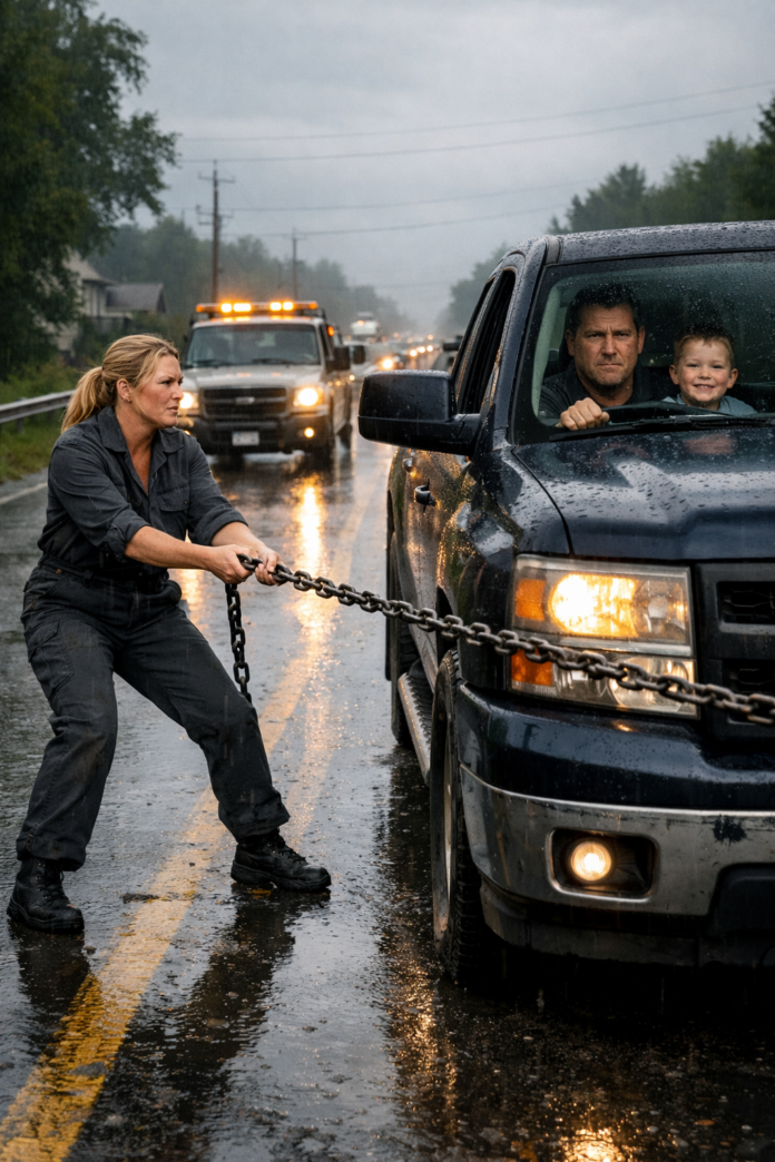 La tempesta urlava mentre agganciavo il SUV al mio camion, la divisa incollata addosso, l’acqua che mi riempiva gli stivali. Quando fu tutto sicuro, risalii in cabina e controllai lo specchietto. I loro fari brillavano debolmente dietro di me, attraverso il diluvio.