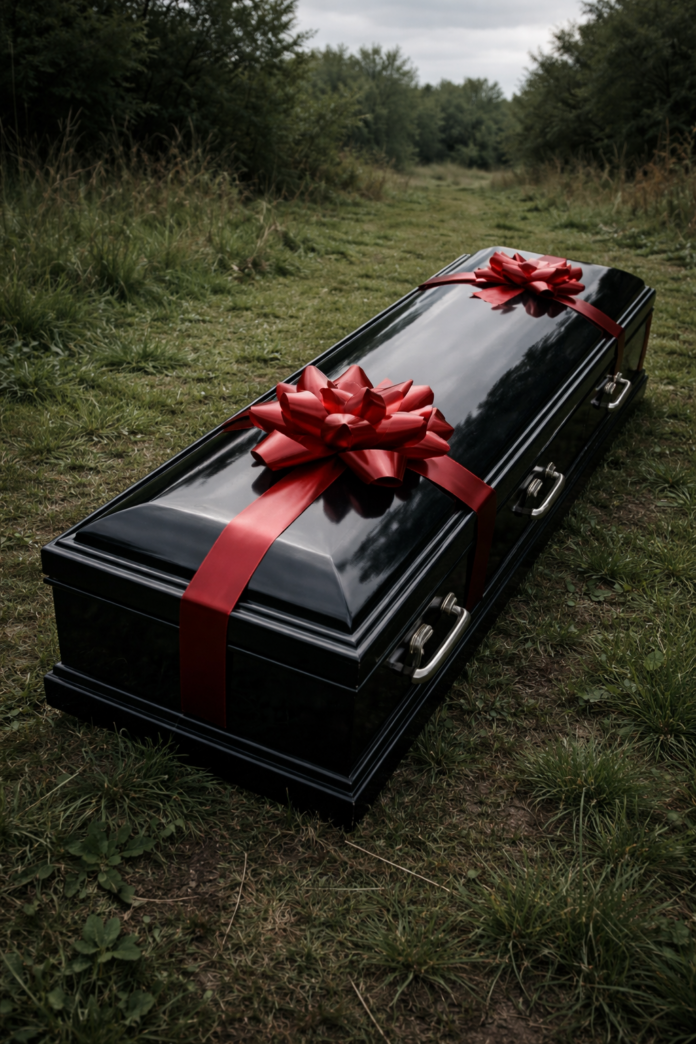 Mi si gelò lo stomaco. Sbatté gli occhi, sperando di star solo immaginando, ma no—era lì. Una vera bara di legno, con un enorme fiocco rosso sopra.